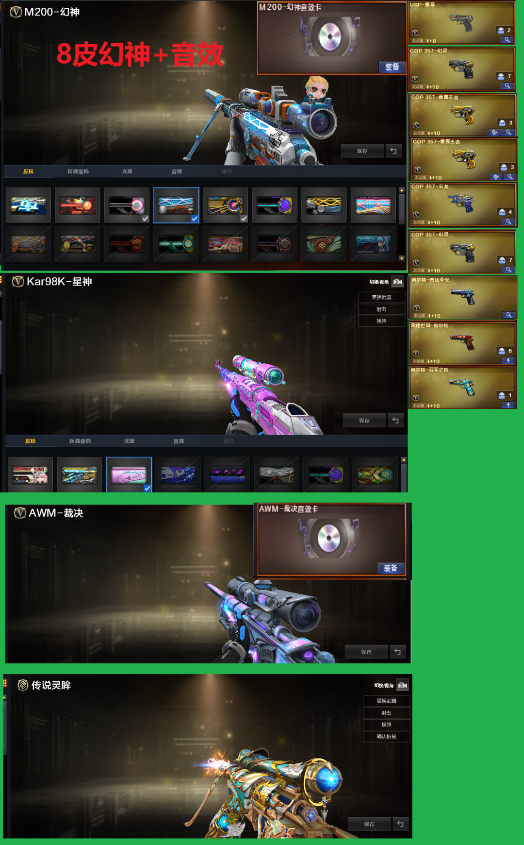 装备描述:排位:可以、、、、、、生化全装(生化背包、查看僵尸血量):无需换弹、6烈6盘、炼狱带音效、MAC5喷火龙、斯太尔蝴蝶、斯泰尔枪娘暗刃、MAC-涂鸦、手斧镜、蝴蝶刀、超级对讲机、全部弹匣、、、、、、、爆破四防:幻神音效8皮肤(权、周瑜、巅峰荣耀、星火小队、女团、宠儿、冠军之幻、纸灯笼皮肤)传说灵眸、98K星神、M200-竞技荣光、王者风神、、、、2个USP雷暴、COP云龙、COP雷霆、COP幻灵、冠军之特、柯尔特竞技荣光、、、、王者蔷薇、王者芳薇、白虎、 、、幻神音效、裁决音效、极光音效、蔷薇音效、白虎音效、毁灭音效、黑龙音效、屠龙音效、天神音效、炼狱音效卡、、、7套幻灵、1套竞技荣光、、、爆破四防(传说女帝、云悠悠、王者春、王者葵、王者影豹)、生化四防(隼、传说影煞)