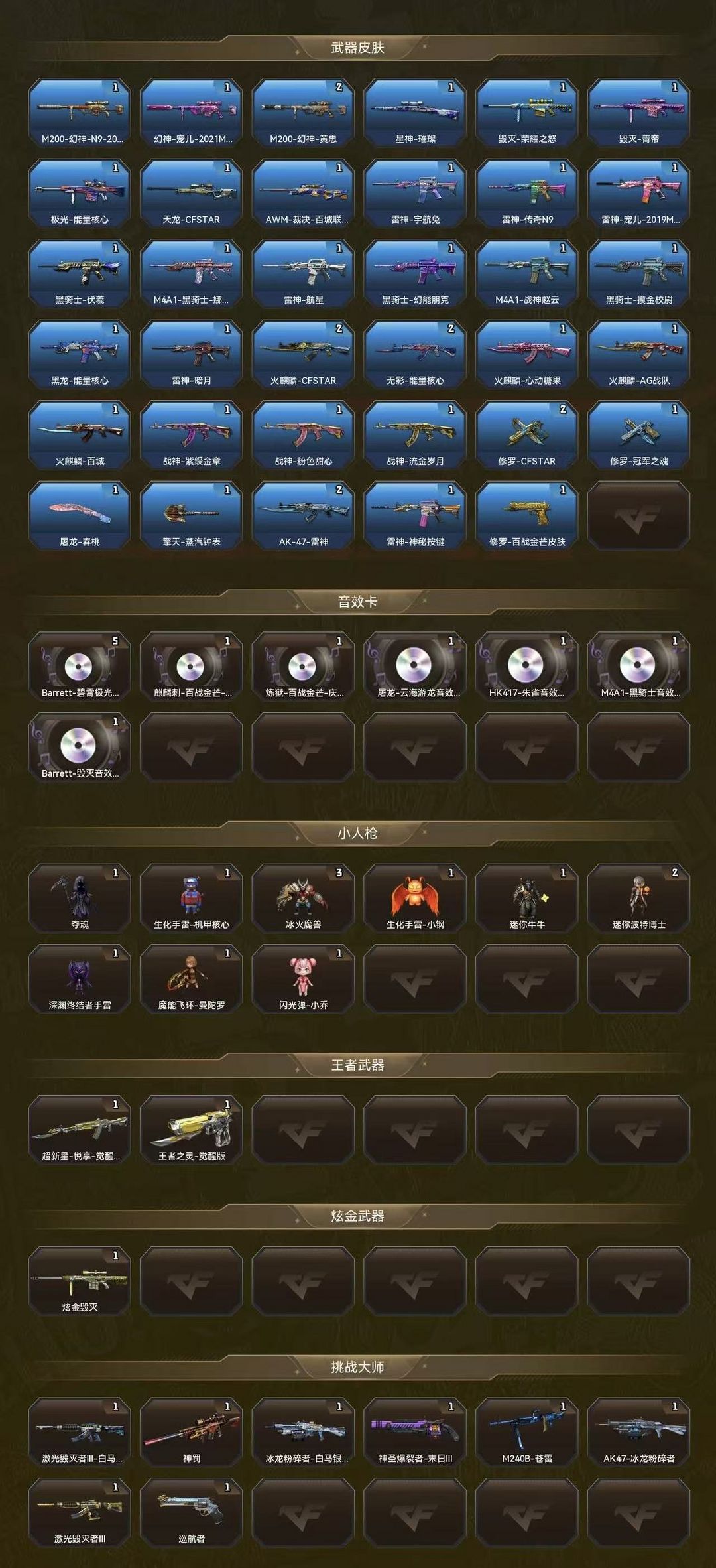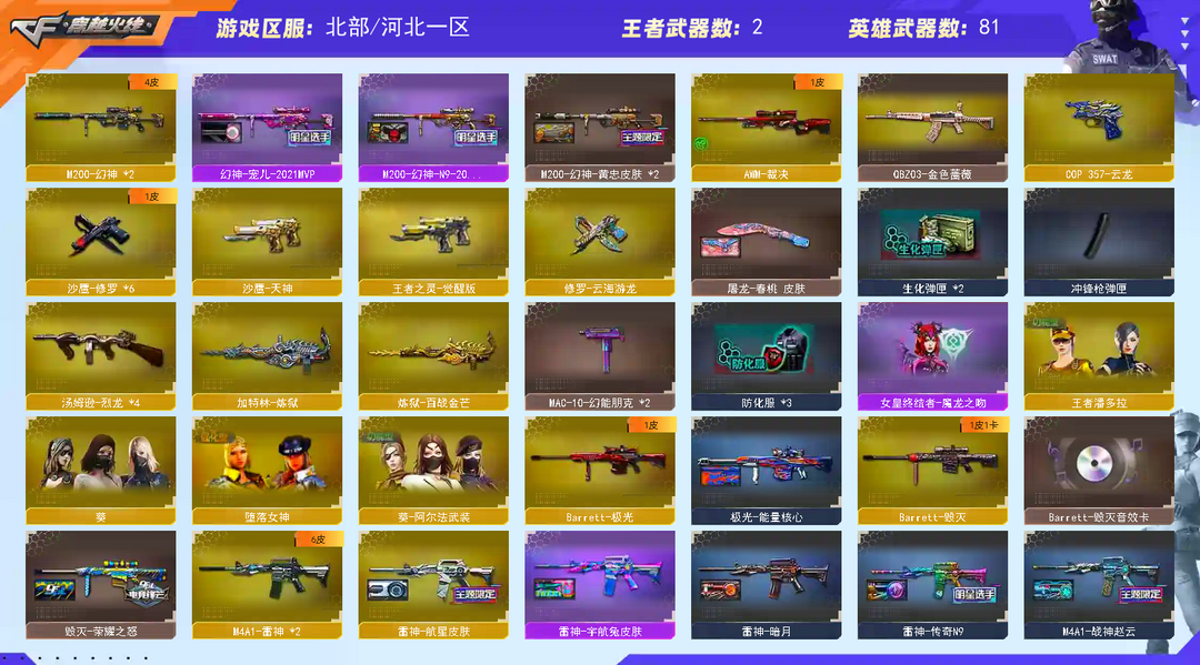 装备描述:✅两幻神带皮肤✅宠儿-黄忠✅云龙套装✅⑥烈龙⑥修罗✅QBZ✅动感闪耀套✅挑战✅王者✅幻神音效卡✅