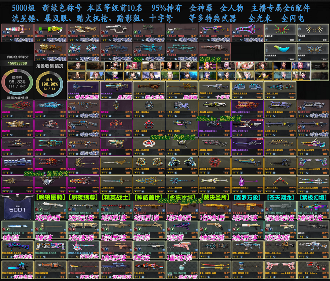 天喵』典藏流星锤☀马神☀紫钻95%持有☀新绿称5千级☀黯火机枪☀9星光束☀黯影狙☀全人物