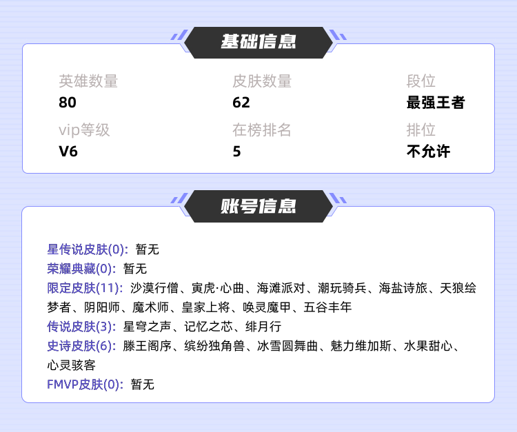 装备描述:>>>>>>毁号,涉及毁坏虚拟财产罪及计算机安全罪,请文明游戏素质游戏,让我们共建美好租号平台>>>>>> 本游戏账号: V6用户,基础段位:最强王者,英雄虽然少,应该有你喜欢的英雄。,皮肤多。 私人所属英雄皮肤有:王昭君 星穹之声||不知火舞 绯月行||公孙离 记忆之芯达摩 沙漠行僧||杨戬 潮玩骑兵||桑启 海盐诗旅||狄仁杰 阴阳师||鬼谷子 五谷丰年||上官婉儿 天狼绘梦者||杨玉环 寅虎·心曲||狄仁杰 魔术师||赵云 皇家上将||刘禅 唤灵魔甲||项羽 海滩派对,等等 注意事项: A.游戏过程中请不要恶意挂机或者不文明发言;B.恶意挂机、顶号等行为将被拉黑无法再次下单;C.进入游戏后中途请勿退出登陆,否则无法再次上号;D.部分账号由于异地登录可能会出现密码错误提示,通常再尝试5-6次后可上号。 |||||||||>喜欢本账号请点 ☆收藏☆ 方便下次租用,谢谢光临惠顾|||||||||