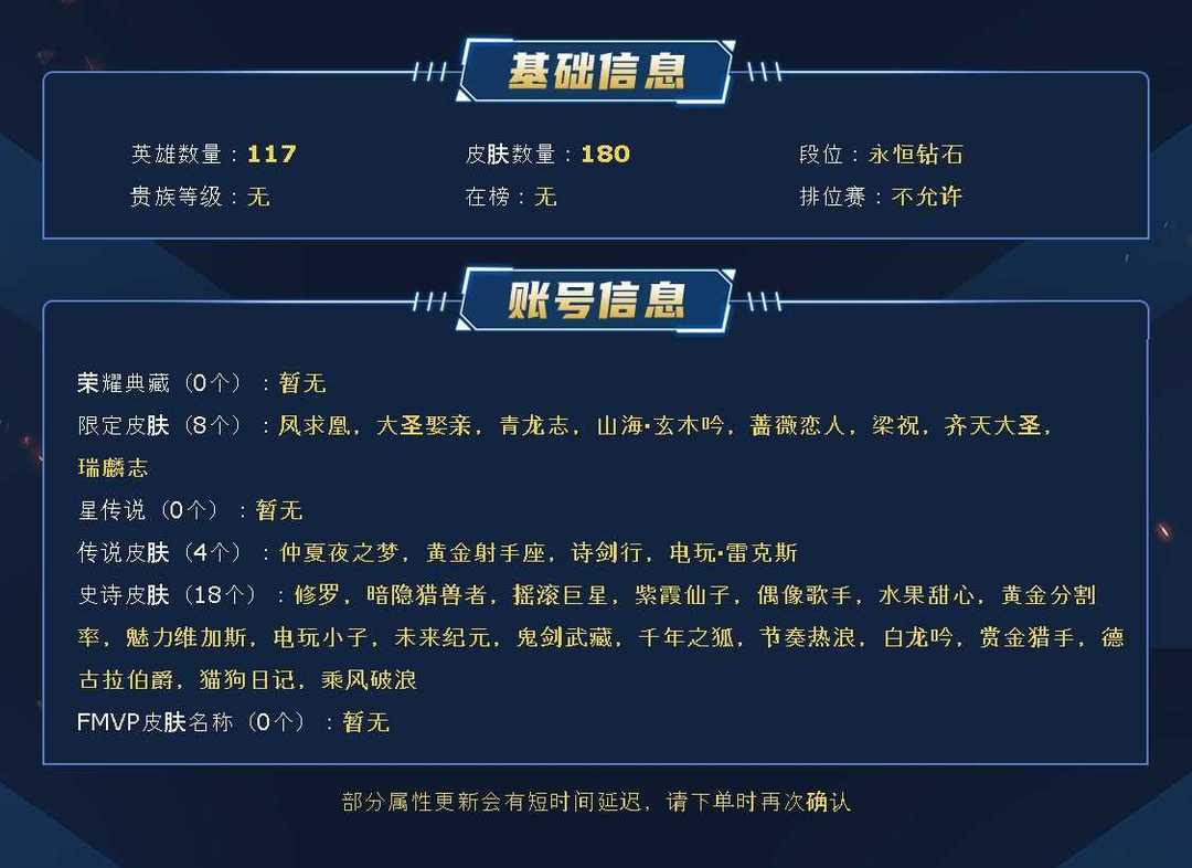 限制: 租号30次及以上 |装备描述:毁号,涉及毁坏虚拟财产罪及计算机安全罪,请文明游戏素质游戏,让我们共建美好租号平台 本游戏账号: V8用户基础段位:永恒钻石IV英雄多皮肤多。典藏皮肤3个感受典藏皮肤带来的优质体验快感 私人所属英雄皮肤有:孙悟空 全息碎影夏侯惇 无限飓风号小乔 天鹅之梦赵云 淬星耀世虞姬 启明星使吕布 天魔缭乱李白 凤求凰武则天 海洋之心后羿 黄金射手座杨戬 永曜之星诸葛亮 武陵仙君孙尚香 末日机甲孙悟空 地狱火等等 注意事项: A.游戏过程中请不要恶意挂机或者不文明发言B.恶意挂机、顶号等行为将被拉黑无法再次下单C.进入游戏后中途请勿退出登陆,否则无法再次上号D.部分账号由于异地登录可能会出现密码错误提示,通常再尝试5-6次后可上号。 喜欢本账号请点 ☆收藏☆ 方便下次租用,谢谢光临惠顾