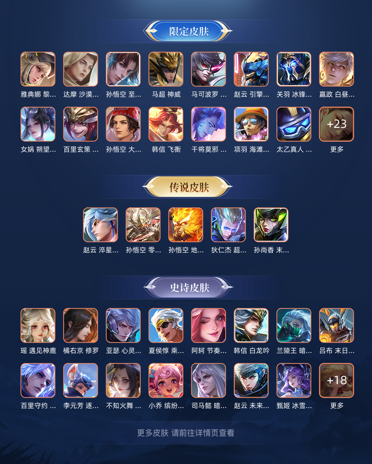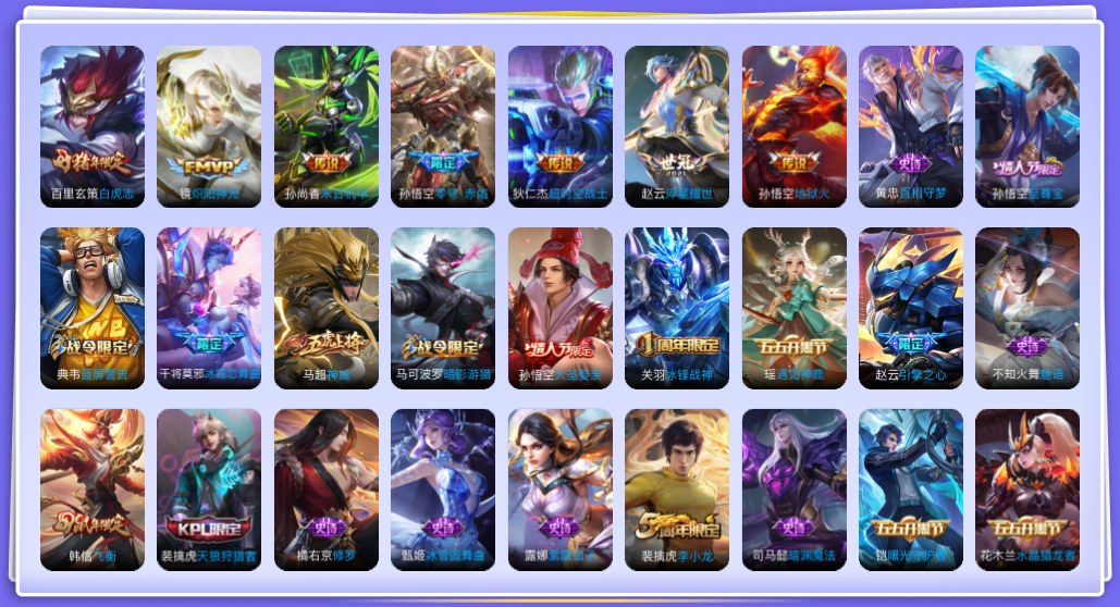 装备描述:96区: 炽阳神光,末日机甲-孙尚香,地狱火,零号·赤焰,淬星耀世,超时空战士-狄仁杰 限定皮: 冰锋战神,遇见飞天,李小龙,梁祝,引擎之心,天狼溯光者,神威,飞衡,天狼狩猎者,冰霜恋舞曲,白虎志,至尊宝,大圣娶亲,高山流水