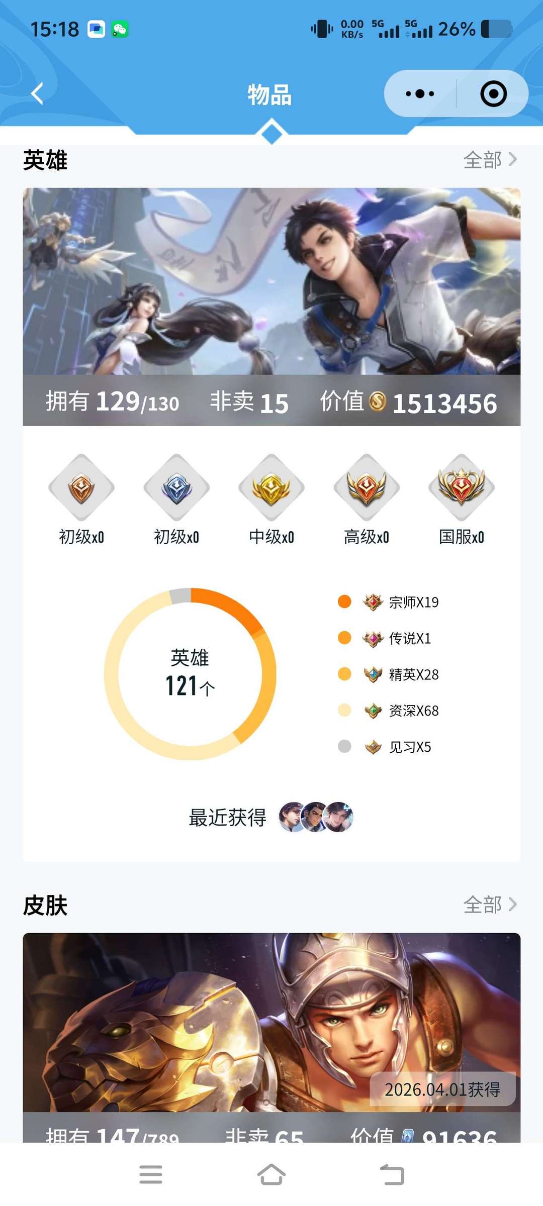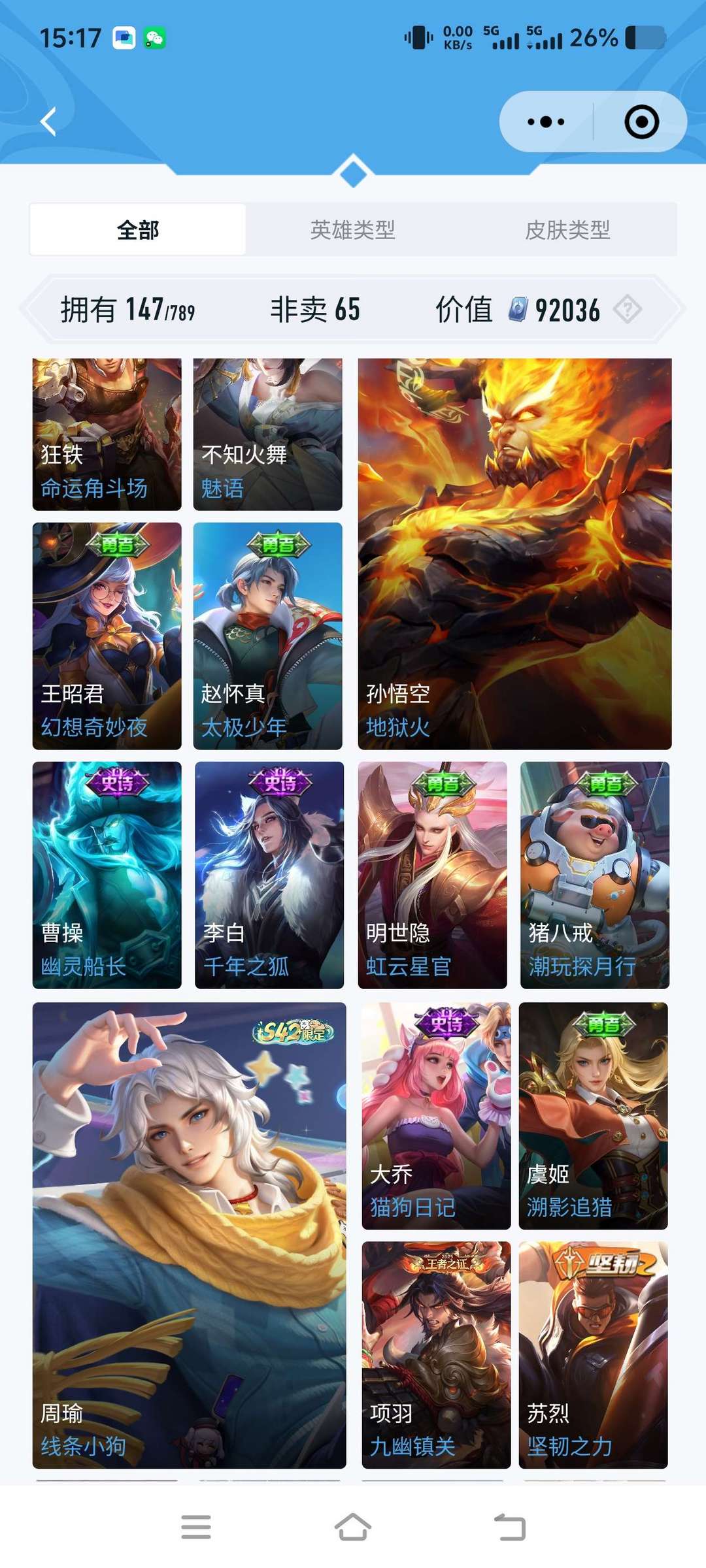 装备描述:英雄全有熟练度,除了武则天英雄全有,皮肤都在照片里 传说皮:地狱火 久胜战神 后羿 元芳等等