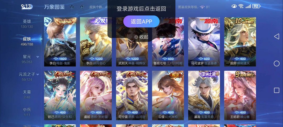 v9李白全皮肤,武则天无双,柯南美少女联动全套,神器系列全套,兔年牛年年限全套,全英雄铭文,价格亲民