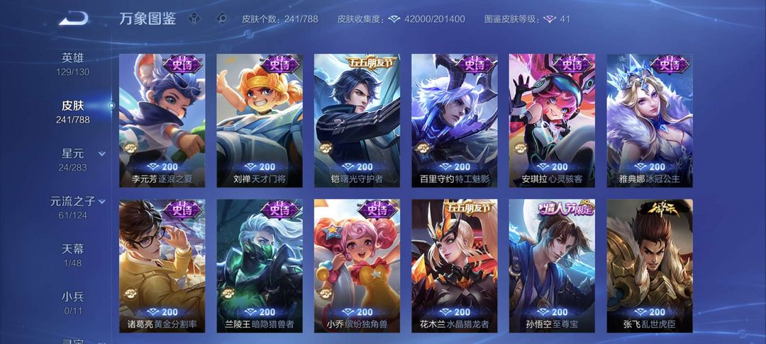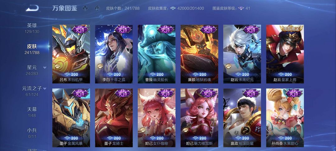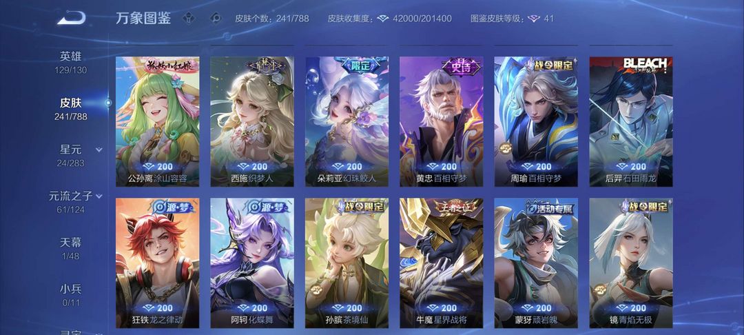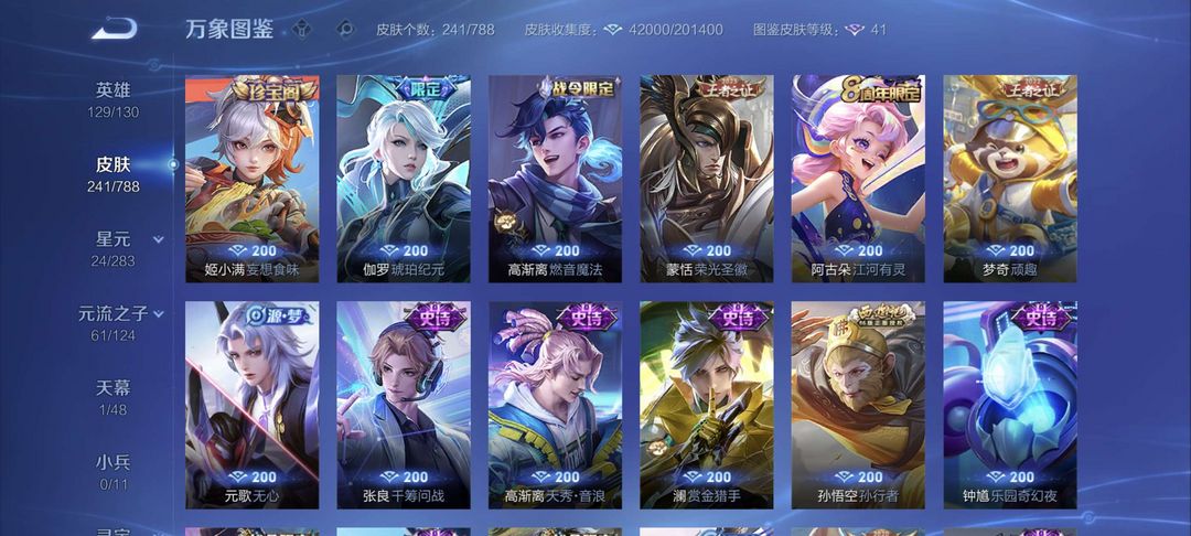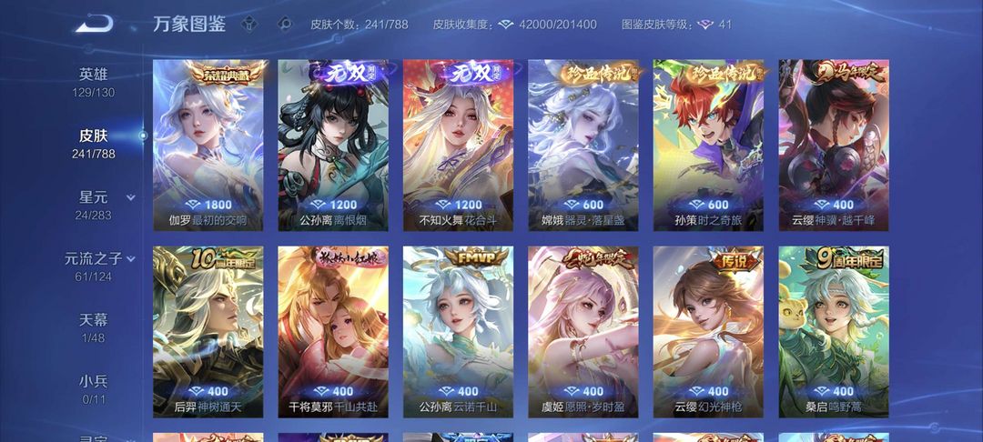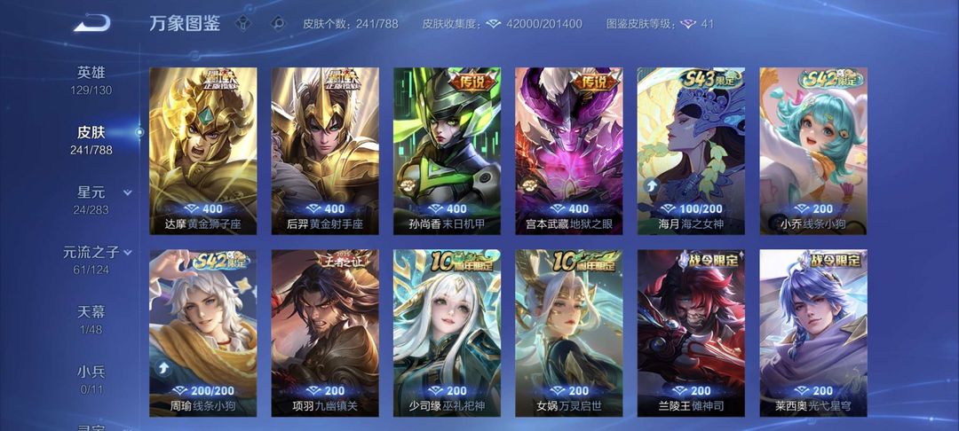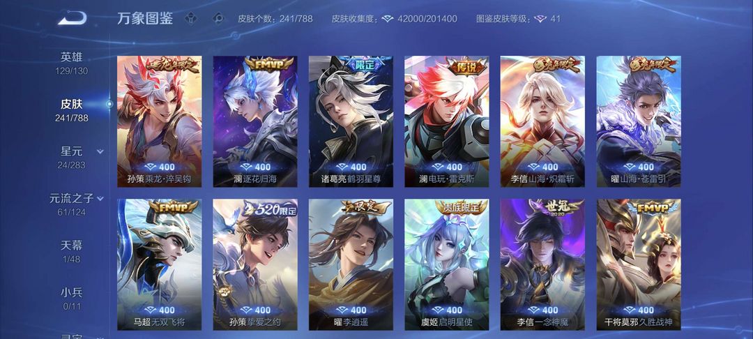 241皮肤|1典藏|2无双|2珍品传说多年限多限定,全英雄满铭文,可排位,体验拉满