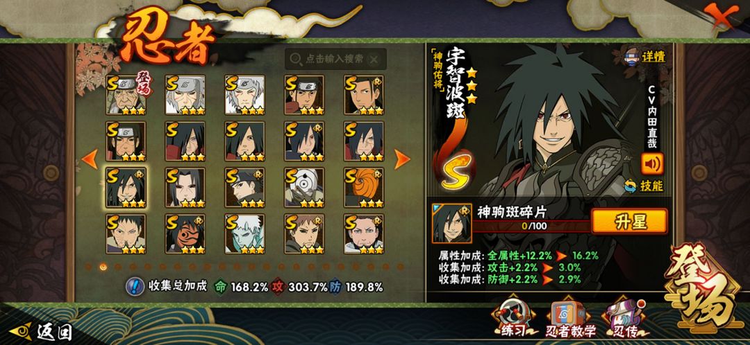 装备描述:34S须佐卡卡西★忍战艾★永恒佐助★忍战樱★九尾鸣人★死门凯★忍战带土★秽土柱间★秽土鼬★仙人兜★秽土斑★熊猫二尾螃蟹万蛇守鹤★惊门凯★百机蝎★泳装照美冥★泳装小南★三船绝★新春鼬★新春水门★1450战力3800魔抗