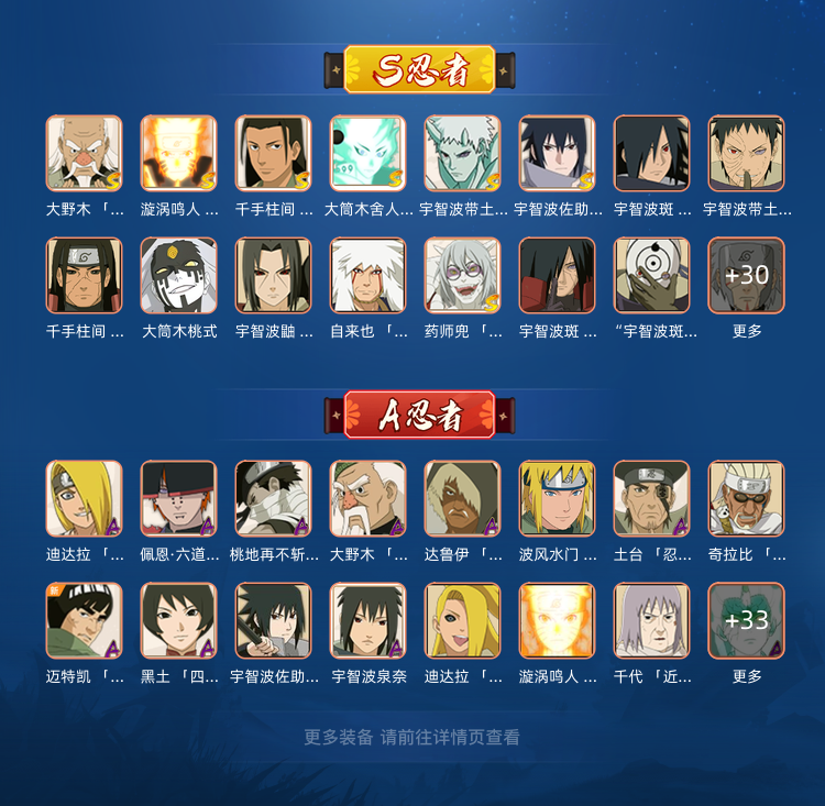 装备描述:秽土二代 忍战宁次 永恒佐助 忍战带土 黄猿 红夜犬 外星人 成龙哥 白面具 创立斑 死三代 植物人 秽土鼬 秽土长门