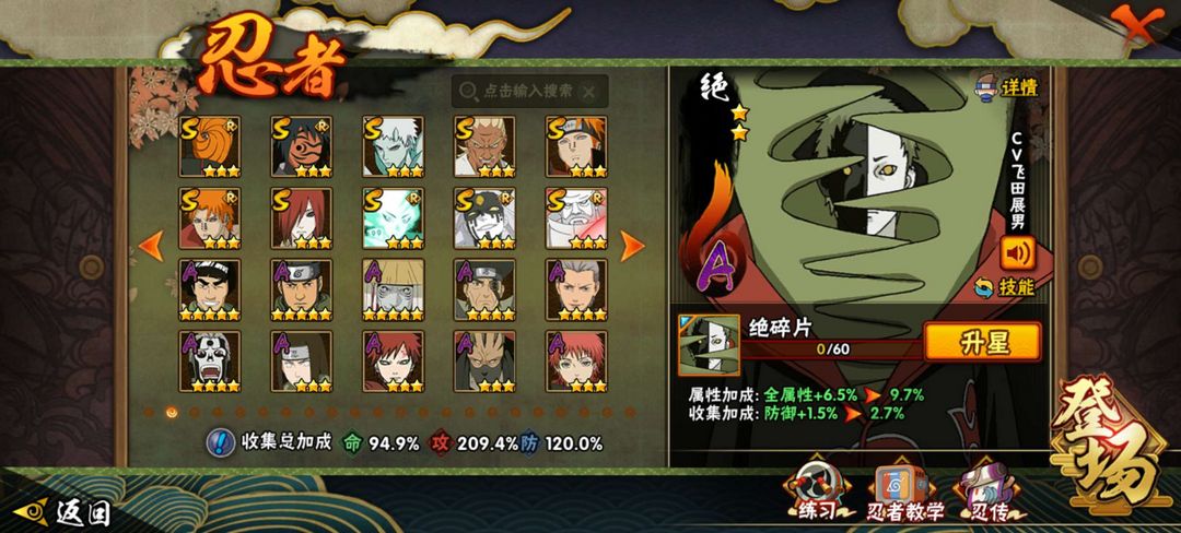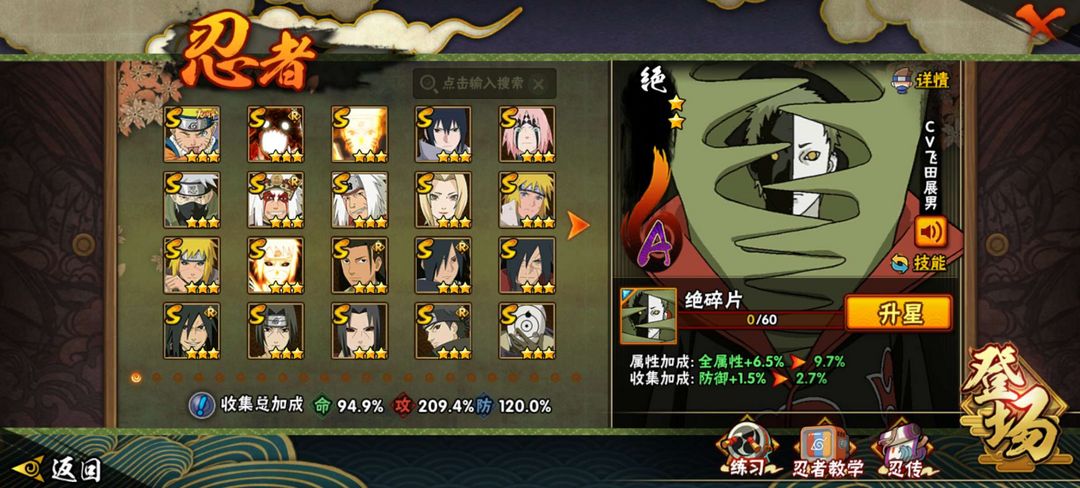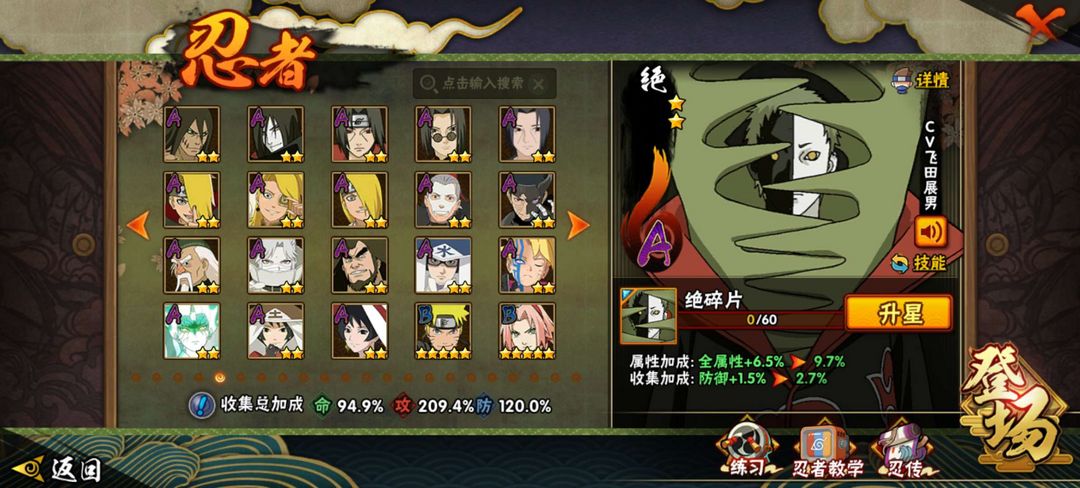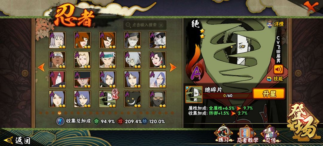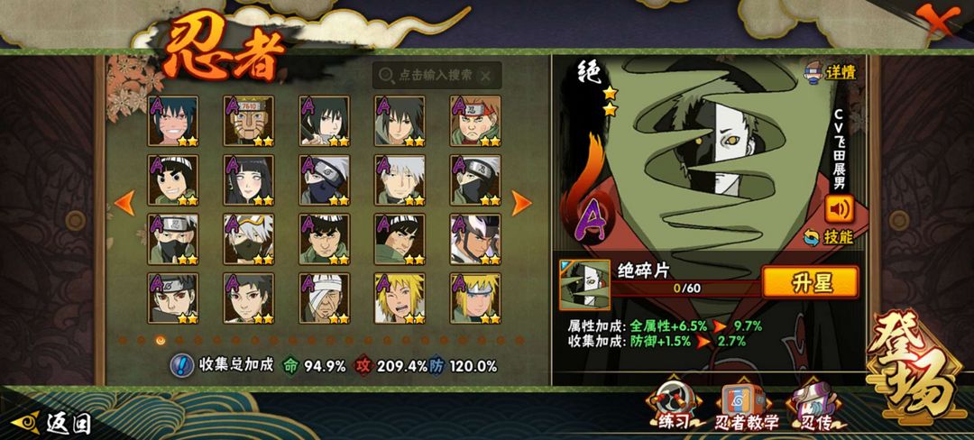 装备描述:漂泊系列全忍者全皮肤,侠影系列没佐助没大野木皮肤,等级152战力1609w,198忍者基本都有皮肤