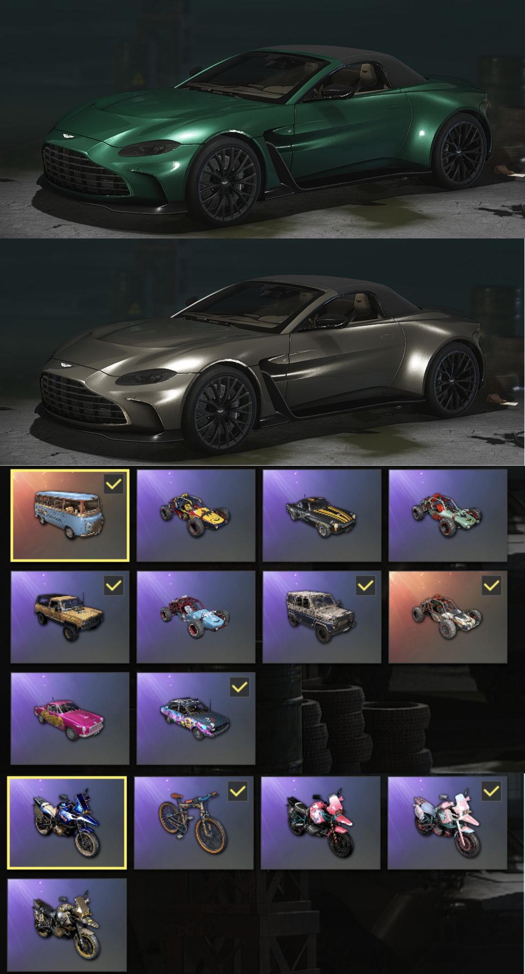 装备描述:【十二神器-保时捷卡宴/竞争者多利安-六级朱雀M416-六级赛危机MK12-妖魔之触ACE32-冰域之主GROZA午夜惊魂98K-黑暗深渊M762-爆裂炸弹AUG-玄武SKS-无重力-MP5K-紫色魔法烟枪-粉色烟雾弹】阿斯顿马丁跑车/孙悟空AKM/青龙ACE/玩偶屋M762/胜利之舞143/144/145/146