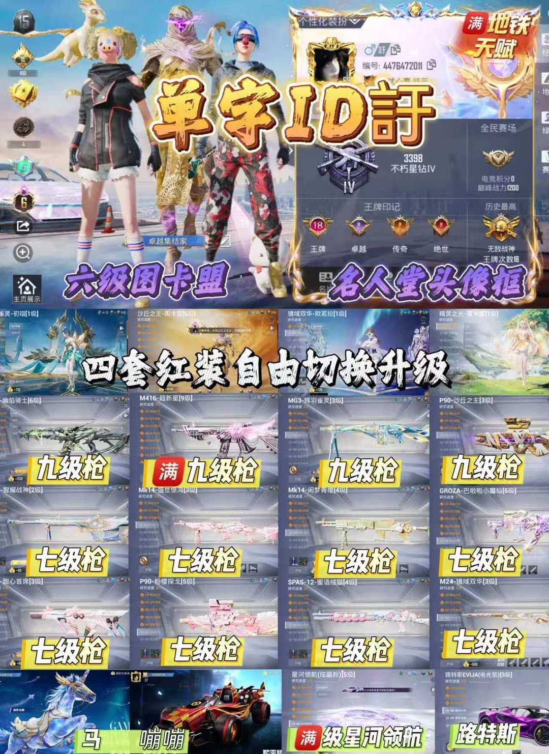 极品单字ID 訏 六级红装图卡盟/满级狗砸/名人堂头像框/星河领航/红嘣/白马/男神套/地铁极品号